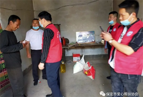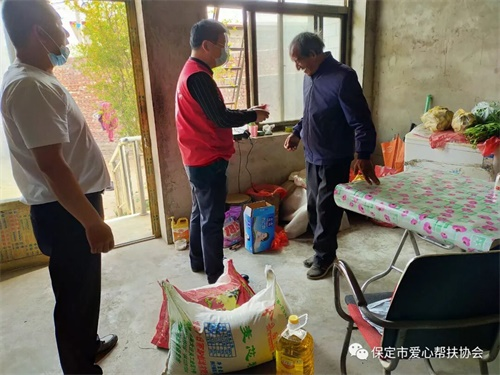 4月16日,在市工商联副主席王丽华带领下,协会党支部书记张进国、副秘书长马高鹏、会员陈鹏、王旭东等一行先后到唐县南雹水村、钓鱼台村,对包户扶贫的10户贫困家庭进行扶贫慰问,分别给每户捐赠米面油一份及200元慰问金。