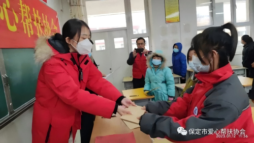 活动中,黄石口镇中学校长邸永飞对协会代表们的到来表达了谢意,他说:天寒因爱暖,遇困见真情,我代表大家感谢你们。希望孩子们学有所成,懂得感恩老师和家长,感恩爱心人士,回报社会。