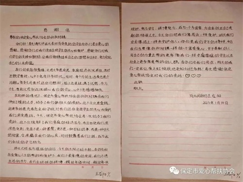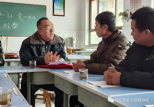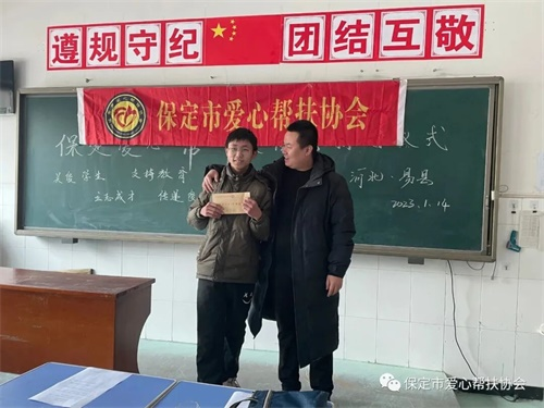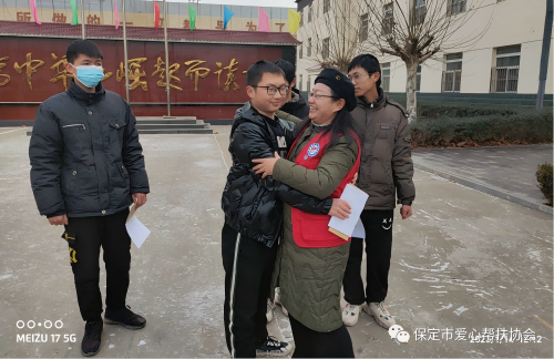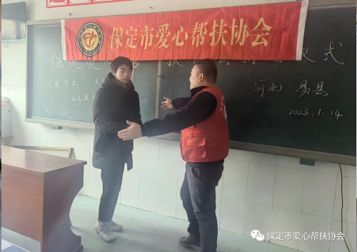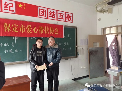 2023年1月14日,农历腊月二十三,正是传统节日小年,保定市爱心帮扶协会副会长齐建瑞,理事殷云飞,副组长薄立康,优秀会员霍文超,河北农业大学大学生志愿者殷润琦一行5人,冒着严寒赶赴易县惠东中学,为4名贫困学生送去爱心助学款8000元。 自2019年以来,协会已连续4次为同学们送来共计约4万元的爱心助学款。