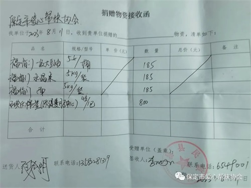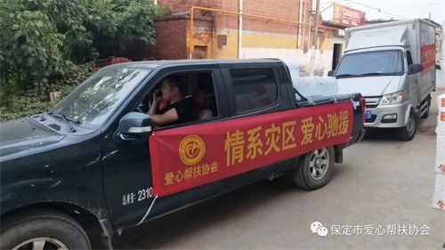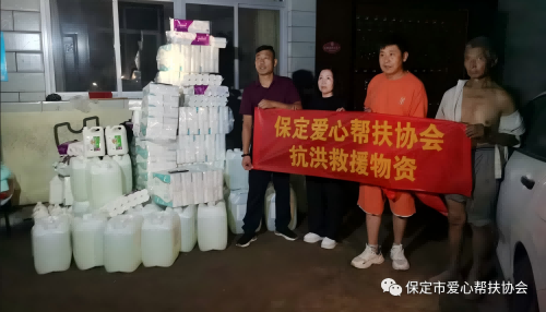 一方有难,八方支援。灾情发生后,保定市爱心帮扶协会积极响应政府和主管部门号召,迅速组织会员为灾区捐款、捐物。会员们纷纷奉献爱心,很快筹集到总价值近4万元的钱款、物资。与涿州市高新区、易县民政局联系,购买灾区所需物资。于8月11日兵分两路,分别赶赴涿州、易县进行捐赠。